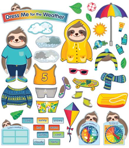 FEATURES This bulletin board features an adorable sloth character that is sure to bring daily fun into learning how to dress for each type of weather.