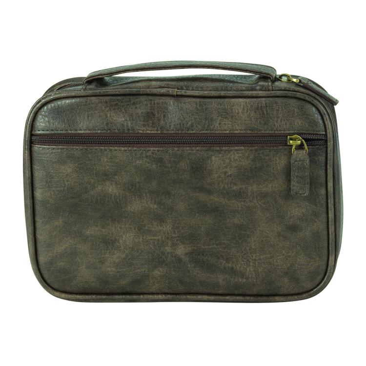 Antique aged look polyurethane with brass and alloy color designer D-rings, Spine handle with designer matching zipper pull, Bookmark and elastic pen loop, Zip closing pocket on front zip closing pouch Size 10 1/4 inches by 2 inches by 7 1/4 inches Height