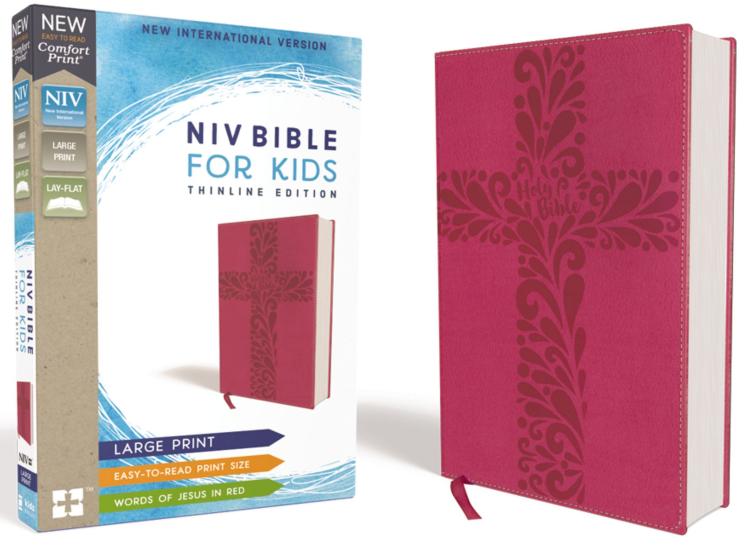 The NIV Bible for Kids, Large Print is perfect for those looking for a convenient size and very readable Bible text.Features include:Clear, readable Comfort Print fontLarge 11.4-point font sizePresentation page for gift givingWords of Christ in redRibbon markerLeathersoft cover with attractive designs