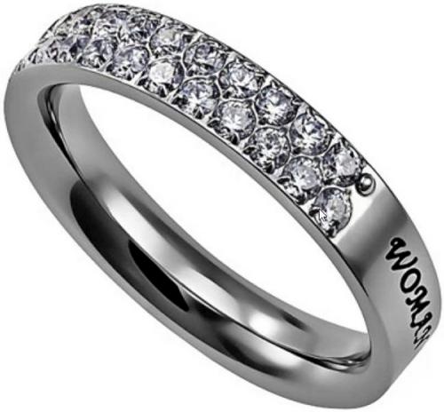 Masterfully Constructed Stainless Steel Ring With Pave Stone Settings Across 5mm Band. Back Side Of Ring Has Woman Of God Proverbs 31 Engraving And Black Enamel Filling.