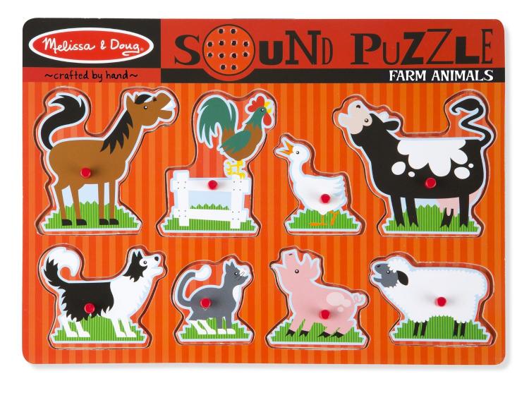 Each happy farm animal “sounds off” in its own voice when its animal puzzle piece is placed correctly in this eight-piece wooden peg puzzle! Your child will enjoy hearing all eight sounds and looking at the full-color, matching pictures under the pieces, while developing matching and listening skills with this captivating multisensory puzzle.