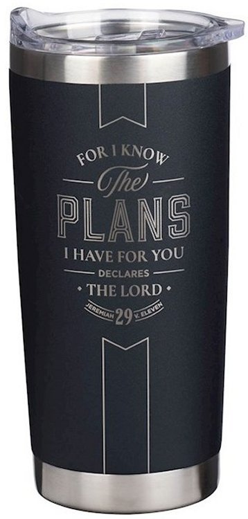 The Plans Black Stainless Steel Mug is part of The Plans Charcoal Collection, designed to celebrate your graduate. This collection includes a faux leather Bible cover, a metal keychain in a tin, a genuine leather wallet, a stainless steel travel mug, a faux leather photo frame, a ceramic coffee mug, a gift bag, a faux leather journal, and a reusable tote bag.