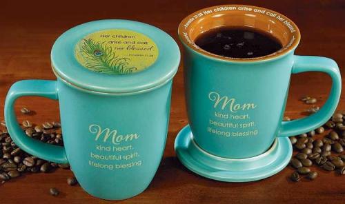 Ceramic mug features a matte finish exterior, glossy interior. Includes a coaster that can also be used as a lid; same design/scripture featured on both sides of lid. White box