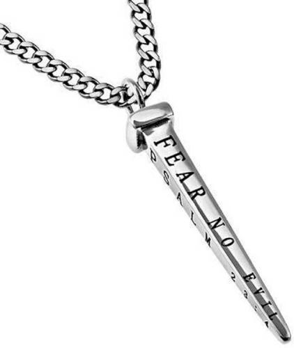 Solid Stainless steel high polished “Nail” with 4 sided engraving and black enamel filling reads “Fear No Evil – Psalm 23:4″. Nail measures 1 ” x ” at widest point. Includes upgrade stainless steel curb chain in 20″ or 24″.