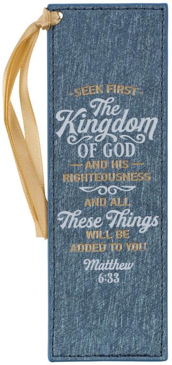 Keep The Kingdom of God Metallic Blue Faux Leather Bookmark tucked inside your Bible and use it as a reminder to not prioritize the day’s worries but to focus your energies on seeking the LORD.
