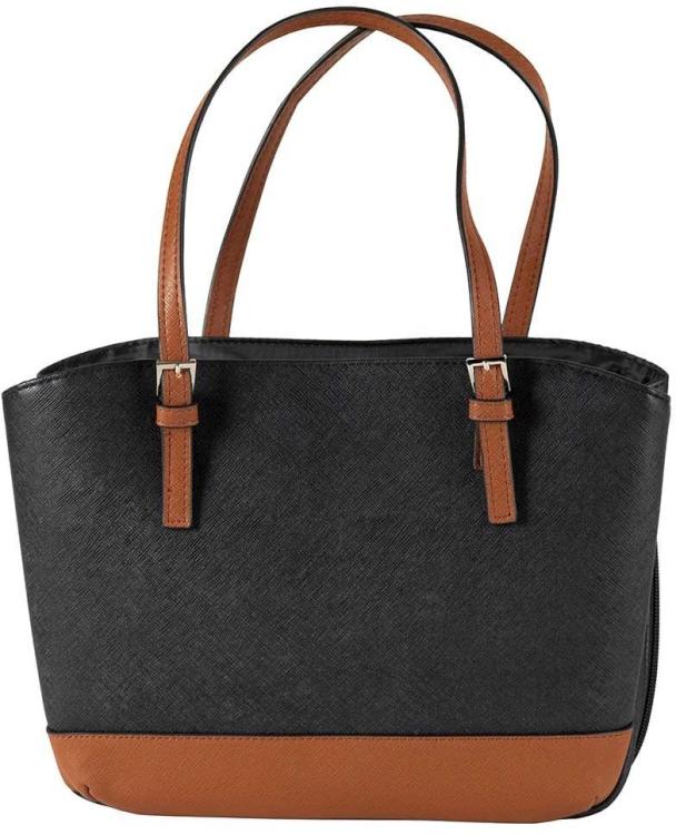 Handbag style BIBLE COVER -BLACK & BROWN SAFFIANO LOOKING PU WITH (10 INCH SHOULDER STRAP HANDLES)Bible cover with large outside pockets- inside book mark & elastic pen loop